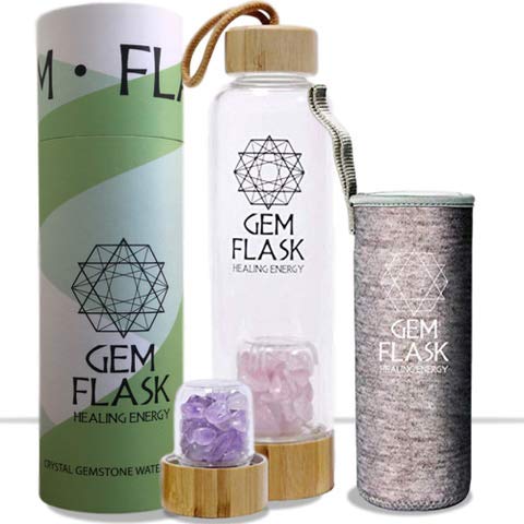GEMFLASK - Bpa Free Crystal Water Bottle - Includes Amethyst and Rose Quartz Healing Crystals and Stones + Free Neoprene Sleeve & Bamboo Lid