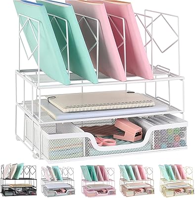 gianotter Desk Organizers and Accessories, Office Supplies Organizer with Sliding Drawer, Double Tray 5 Upright Section File Sorter White