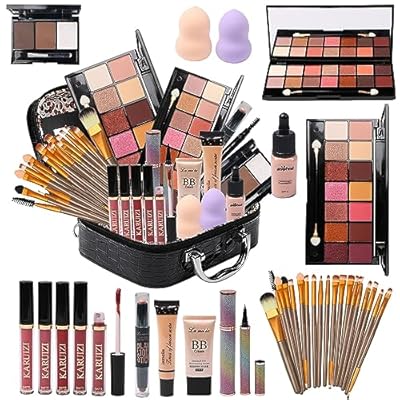 All in One Makeup Kit for Makeup storage bag 2X14 Colors Eyeshadow Palette Liquid Foundation Eyeliner Pencils Contouring Stick Lip Gloss 20Pcs Make up Brushes For Women Girls Teens Black