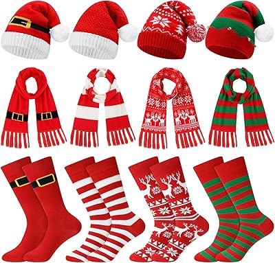 Liitrsh 12 Pack Christmas Winter Accessories Set, 4 Christmas Beanies 4 Knitted Scarves and 4 Pairs of Holiday Socks Soft Warm Xmas Hat Scarf Sock Set for Family Parties Gifts